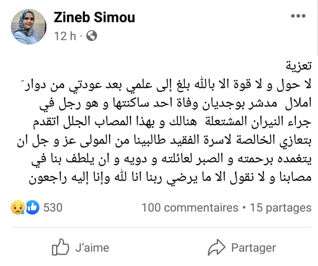 وقالت البرلمانية زينب السيمو، عن حزب التجمع الوطني للأحرار (قائد الائتلاف الحكومي)، أن “رجلا توفي بدوار أملال جراء النيران المشتعلة هناك”.