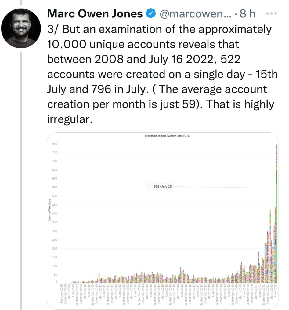 وفضحت هذه الدراسة حقيقة الحملة، بقول الدكتور مارك :”عندما قمت بفحص ما يقرب من 10000 حساب شخصي، إكتشفت أنه بين عامي 2008 و16 يوليوز 2022، تم إنشاء 522 حسابًا في يوم واحد، أي يوم 15 يوليوز ،علما أن متوسط إنشاء الحسابات في الشهر الواحد هو 59 حسابا فقط”.