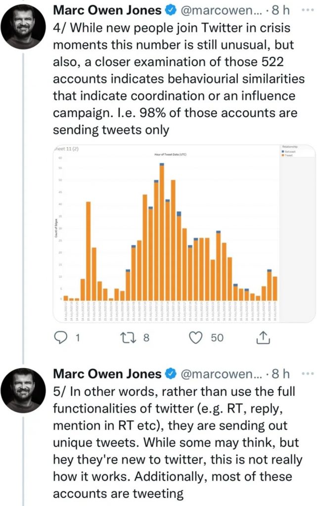 وبدلاً من استخدام الوظائف الكاملة لتويتر، مثل RT، والرد، والإشارة في RT، إلخ)، يوضح الدكتور مارك، فإن من وراء الحسابات البالغ عددها 522 حسابا مشبوها، يرسلون تغريدات فريدة. تغالط المغردون وبما يجعلهم يعتقدون أنها حسابات جديدة على تويتر.