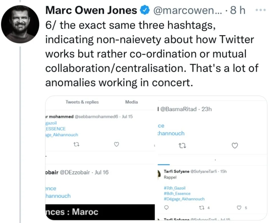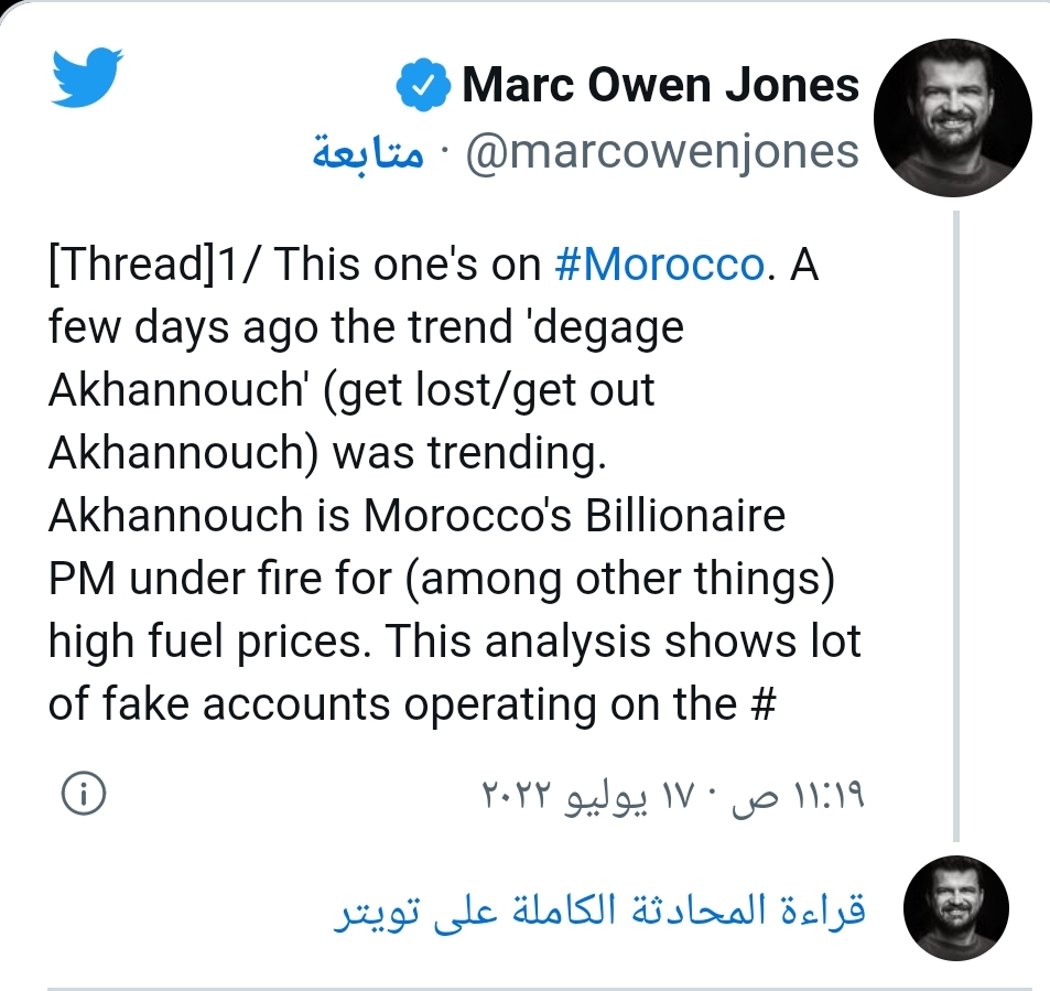 ذكر الدكتور مارك الذي يقيم في قطر في دراسته، ” كان قبل أيام قليلة، الهاشتاغ المتصدر في المغرب، هو (أخنوش إرحل)، والسبب يعود إلى ارتفاع أسعار المحروقات”، لكن يضيف الخبير الدولي:” الحملة تحركت بحسابات وهمية”.