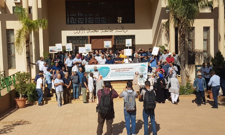 قام يومه الخميس 22 شتنبر 2022 مجموعة من الأساتذة بجامعة محمد الأول المنخرطين في النقابة المغربية للتعليم العالي والبحث العلمي، بوقفة احتجاجية أمام مقر رئاسة جامعة محمد الأول، استجابة لـ”البرنامج النضالي” النقابي على المستوى الوطني والذي يقاطعون على إثره الدخول الجامعي الحالي لمدة أسبوع ابتداء من الاثنين 19 شتنبر الجاري، ضد تصريحات وزير التعليم العالي والبحث العلمي والابتكار عبد اللطيف الميراوي، بسبب تقليله من مقاطعتهم للدخول الجامعي الجديد، ومندّدين بـ”سياسة التسويف والمماطلة التي تنهجها الوزارة الوصية اتجاه الملف المطلبي للأساتذة الباحثين”.