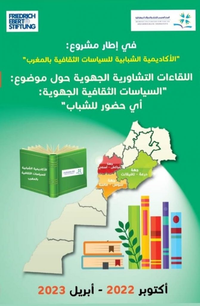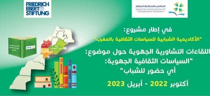 يطلق المركز المغربي للشباب والتحولات الديمقراطية ابتداء من شهر أكتوبر 2022 سلسلة اللقاءات التشاورية الجهوية حول موضوع “السياسات الثقافية الجهوية: أي حضور للشباب”، والتي سيتم تنظيمها بثلاث جهات على المستوى الوطني: درعة – تافيلالت، مراكش – آسفي، وسوس – ماسة، خلال الفترة الممتدة بين أكتوبر 2022 – أبريل 2023.