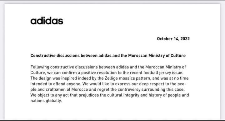 وجاء في بيان للشركة بتاريخ اليوم (14 أكتوبر الجاري): “بعد مناقشات بناءة مع وزارة الثقافة المغربية، نؤكد توصلنا إلى حل إيجابي لمشكلة قمصان كرة القدم الأخيرة.