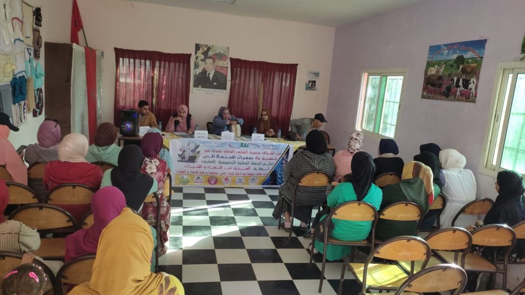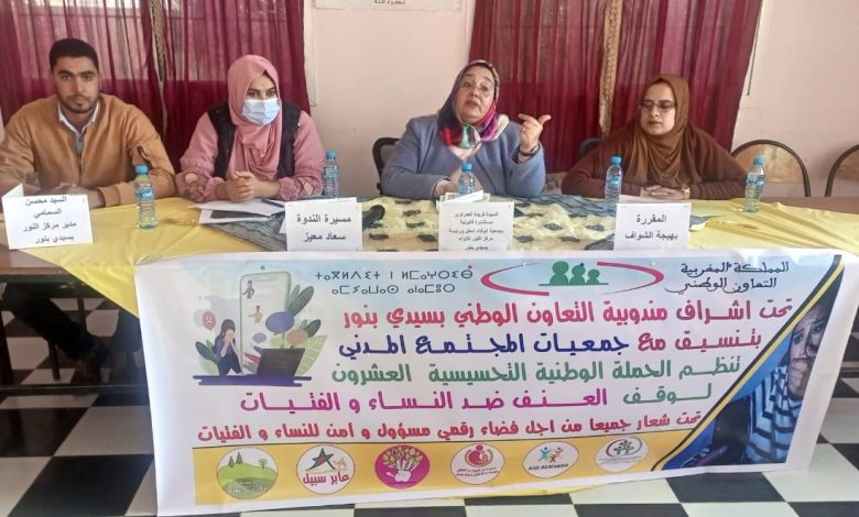تماشيا مع الحملة الوطنية العشرون لمناهضة العنف ضد النساء والفتيات، و في إطار ممارسة وتطبيق قانون 103.13، تم تنظيم ندوة تحسيسية لفائدة نساء مدينة سيدي بنور تحت شعار “جميعا من أجل فضاء رقمي ومسؤول للنساء والفتيات”، تحت إشراف مندوبية التعاون الوطني بسيدي بنور، وبتنسيق مع جمعيات المجتمع المدني؛ حول موضوع “العنف الرقمي ضد النساء والفتيات” من تقديم الأستاذة فريدة العدراوي محامية ومستشارة بجمعية الوفاء امطل، و رئيسة جمعية النور للإيواء والتكفل بالنساء، التي سيرتها سعاد معيز، والمقرران بهيجة الشواف ومحسن السمامي.