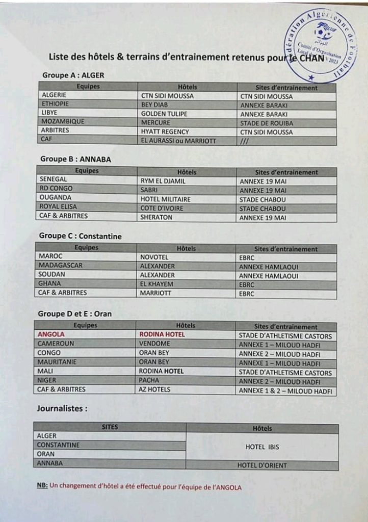 كما أعلن الاتحاد الجزائري لكرة القدم،عن الائحة الرسمية والمعتمدة لأماكن إقامة المنتخبات المشاركة في هذه البطولة بالإضافة إلى الملاعب الخاصة بالتداريب.