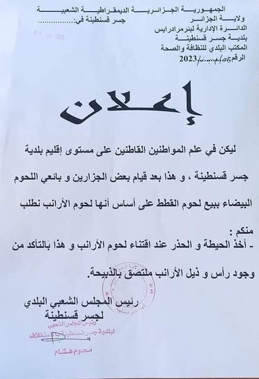 و أعلنت بلدية جسر قسنطينة التابعة لولاية الجزائر العاصمة، عن وجود لحوم قطط تباع في أسواق البلدية على أنها لحوم أرانب. كما طالبت ذات المصالح إلى أخذ الحيطة والحذر عند اقتناء لحوم الأرانب بالتأكد من وجود رأس وذيل الأرنب ملتصقة بالذبيحة.