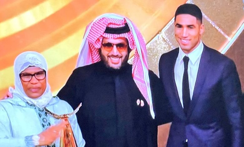 وصعدت والدة حكيمي إلى مسرح “جوي أوردس” في السعودية، بعد أن سبق لها واستقبلها الملك محمد السادس مع أمهات اللاعبين بفريق أسود الأطلس لدى تكريمه للمنتخب المغربي بعد المونديال في دجنبر الماضي.