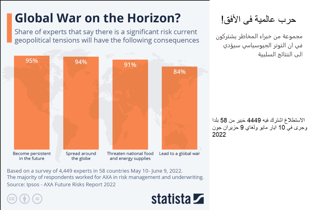 رسم الاستطلاع الذي أجري عام 2022 من قبل خبراء المخاطر في شركة التأمين AXA وغيرها من الشركات الكبرى، (رسم) صورة متشائمة لما يمكن أن يقودنا إليه الوضع الجيوسياسي الحالي. وكما حذرت مؤخرا نشرة علماء الذرة، مؤلفو بيان ساعة يوم القيامة، فإن “حرب روسيا على أوكرانيا أثارت تساؤلات عميقة حول كيفية تفاعل الدول، الأمر الذي أدى إلى تآكل معايير السلوك الدولي التي تدعم الاستجابات الإيجابية لمجموعة متنوعة من المخاطر العالمية”.