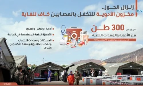 وأبرز مرابطي أن قطاع الصحة سارع منذ الساعات الأولى التي أعقبت المأساة إلى توفير أكثر من 200 طن من الأدوية والمعدات الطبية، تم نقلها نحو جميع المستشفيات والمنشآت الصحية بالمناطق المتضررة.