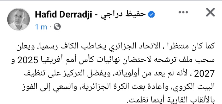 أعلن المعلق الرياضي في قنوات “بي ان سبورتس” القطرية حفيظ دراجي عبر صفحته بالفايسبوك سحب بلاده ملف الترشح لاستضافة كان 2025 و 2027 قائلا : كما كان منتظرا ، الاتحاد الجزائري يخاطب الكاف رسميا، ويعلن سحب ملف ترشحه لاحتضان نهائيات كأس أمم أفريقيا 2025 و 2027 ، لأنه لم يعد من أولوياته، ويفضل التركيز على تنظيف البيت الكروي، واعادة بعث الكرة الجزائرية، والسعي إلى الفوز بالألقاب القارية أينما نظمت.