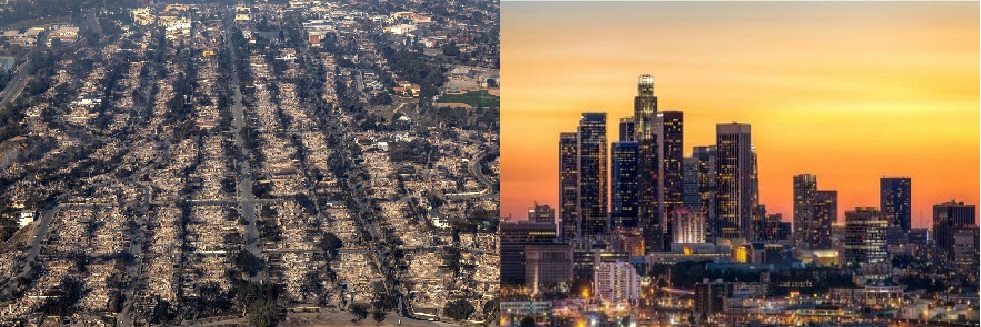 وتعيش الولايات المتحدة الأمريكية هذه الأيام جحيما حقيقيا أتت خلاله النيران على مدينة لوس أنجلوس التي يسكنها أغلب الميارديرات والمشاهير في سينما هوليود ورجال المال والأ عمال، حيث حولتها الحرائق في رمشة عين إلى حطام مخيف. قدرت سائره بأزيد من 250 مليار دولار.