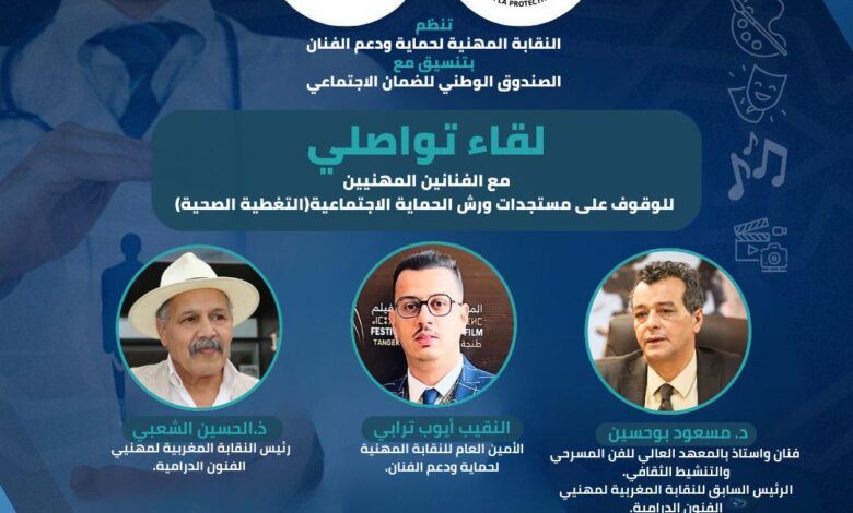 تنظم النقابة المهنية لحماية ودعم الفنان ، بتنسيق مع الصندوق الوطني للضمان الاجتماعي لقاء تواصليا مع الفنانين المهنيين للوقوف على مستجدات ورش الحماية والاجتماعية المتعلق بالفنان (التغطية الصحية)، وذلك يوم الجمعة 18 أبريل 2025، بغرفةالصناعة والتجارة والخدمات لجهة الدار البيضاء سطات.