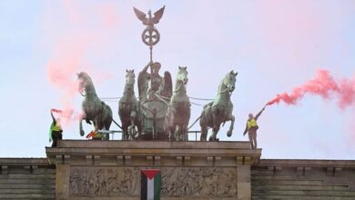 الشرطة الألمانية تعتقل متظاهرين تسلقوا بوابة براندنبورغ وعلقوا لافتة مؤيدة لفلسطين