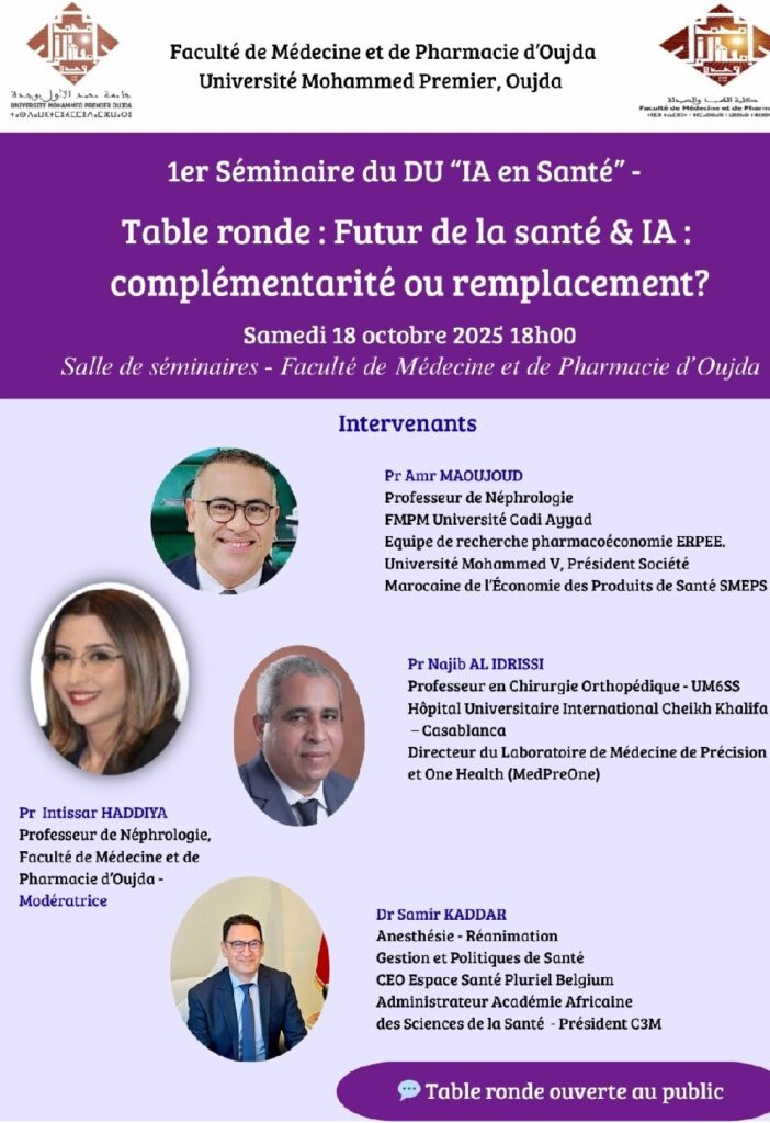 إضافة إلى الجلسة الافتتاحية التي سيؤطرها خبراء، سيتم تنظيم مائدة مستديرة مفتوحة للعموم: تحت عنوان “مستقبل الصحة والذكاء الاصطناعي: تكامل أم تعويض؟”..