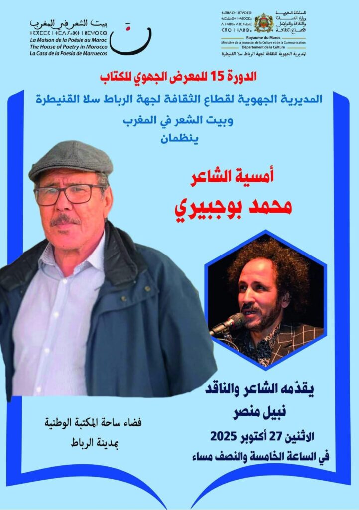 يحلّ الشاعر محمد بوجبيري ضيفا على بيت الشعر في المغرب ضمن فعاليات الدّورة 15 للمعرض الجهوي للكتاب الذي تنظمه المديرية الجهوية لقطاع الثقافة بجهة الرباط-سلا-القنيطرة، تحت شعار “القراءة، مسيرة متجددة ” وذلك خلال الفترة ما بين 25 و30 أكتوبر 2025 بـفضاء ساحة المكتبة الوطنية للمملكة المغربية – الرباط.