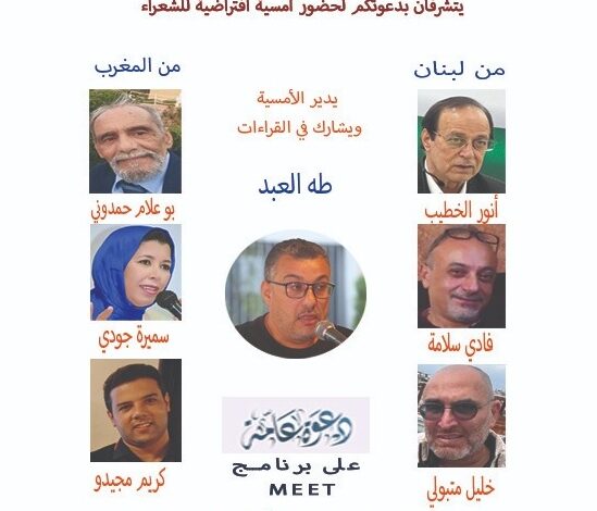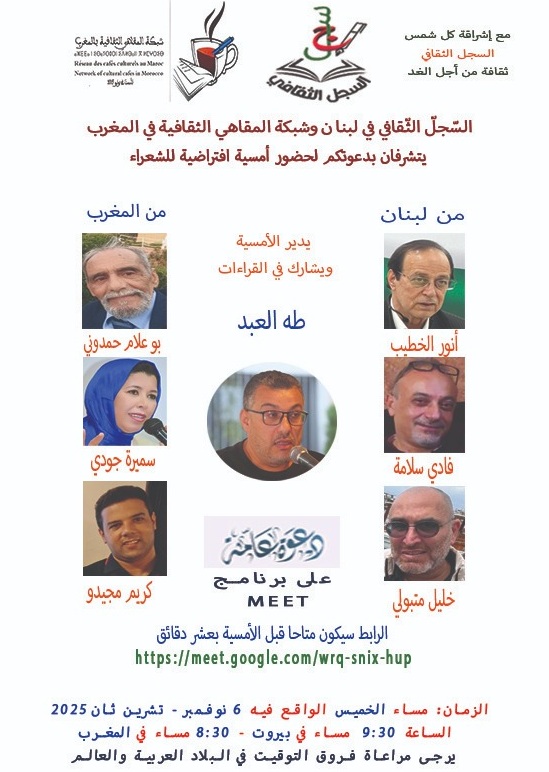 تفعيلا للشراكة الموقعة بينهما مؤخرا ، ينظم السجل الثقافي في لبنان وشبكة المقاهي الثقافية بالمغرب ، أمسية شعرية إفتراضية ، بمشاركة الشعراء أنور الخطيب وفادي سلامة وخليل متبولي من لبنان .