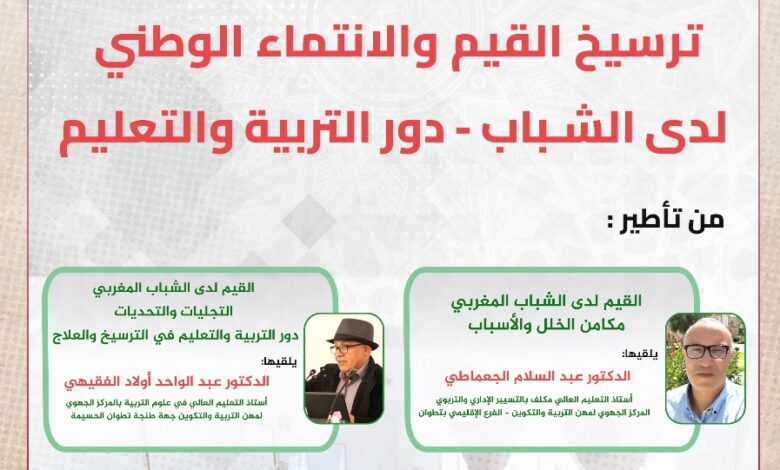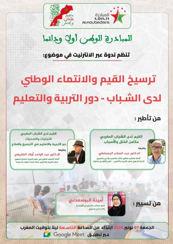 تنظم المبادرة الوطن أولا وأخيرا، ندوة غبر الانترنيت يوم الجمعة 07 نونبر 2025، يشارك فيها كل من الدكتور عبد السلام الجعماطي في موضوع “القيم لدى الشباب المغربي مكامن الخلل والسباب” و الدكتور عبد الواحد الفقيهي في موضوع” القيم لدى الشباب المغربي التجليات والتحديات”، وتسير هذه الندوة أمينة البوسعديني عضو المكتب التنفيذي للمبادرة الوطن أولا وأخيرا.