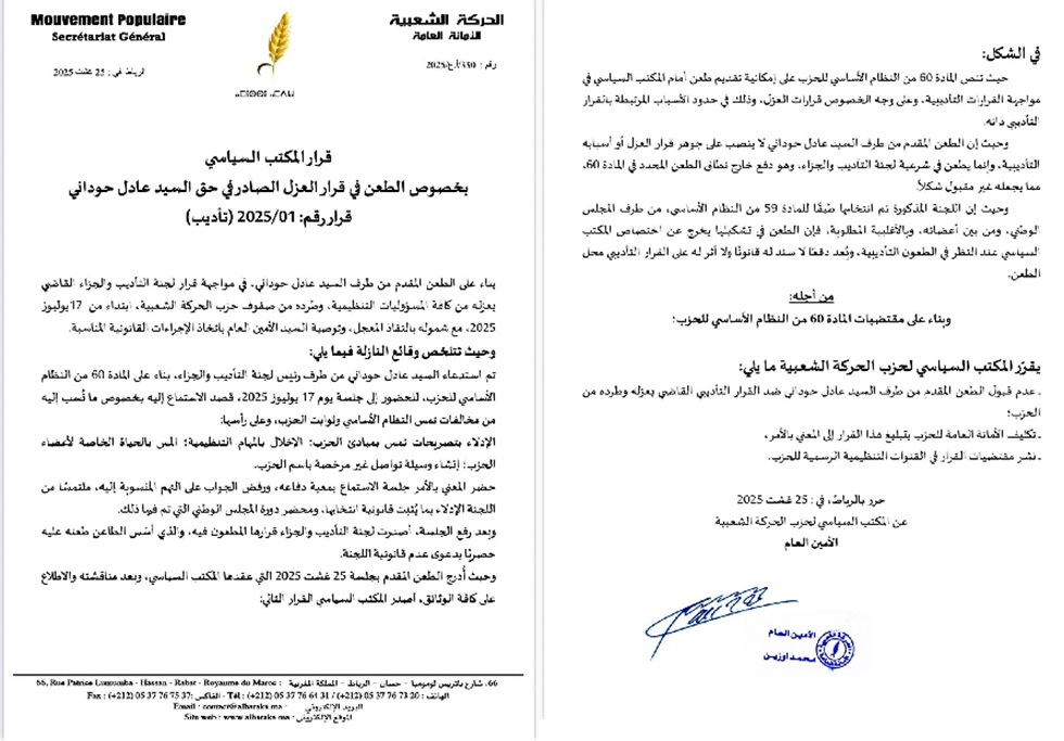 كما يضع القرار حدًا للجدل الذي رافق قضية عادل حوداني خلال الأسابيع الأخيرة، ويعيد التأكيد على أن الحركة الشعبية تتجه نحو ضبط بيتها الداخلي استعدادًا للاستحقاقات المقبلة، في إطار من الصرامة والانضباط والشفافية التنظيمية.