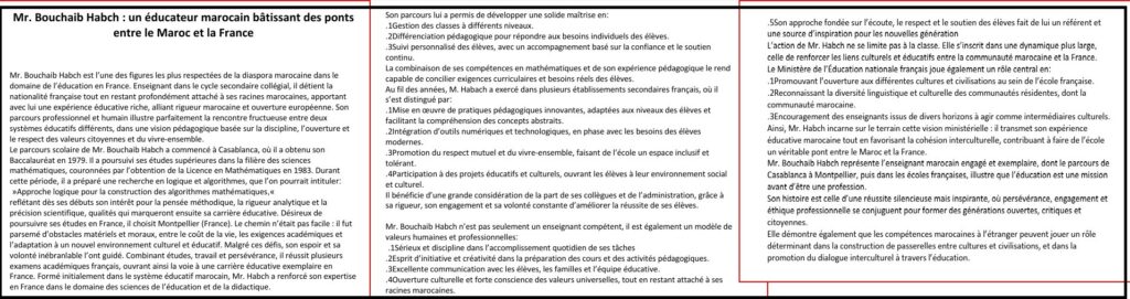 وهكذا، يجسّد السيد حبش على أرض الواقع هذه الرؤية الوزارية: فهو ينقل خبرته التربوية المغربية مع تعزيز التماسك بين الثقافات، مساهمًا في جعل المدرسة جسرًا حقيقيًا بين المغرب وفرنسا.