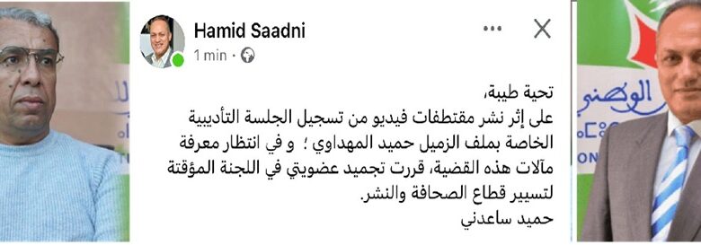 وجاء هذا القرار، حسب مضمون التدوينة، على إثر ما تم نشره من مقاطفات فيديو من تسجيل الجلسة التأديبية الخاصة بملف الزميل حميد المهداوي، يقول حميد ساعدني..