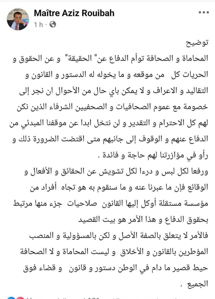 كتب الأستاذ عزيز رويبح نقيب هيئة المحامين بالرباط توضيحا على صفتحه الشخصية بمواقع التواصل الاجتماعي، يقول فيه، “المحاماة والصحافة توأم الدفاع عن الحقيقة وعن الحقوق والخريات كل من موقعه وما يخوله له الدستور والقانون والتقاليد والأعراف، ولا يمكن بأي حال من الأحوال أن نجر إلى خصومة مع عموم الصحافيات والصحفيين الشرفاء الذين نكن لهم كل الاحترام والتقدير ولن نتخلى أبدا عن موقفنا المبدئي من الدفاع عنهم والوقوف إلى جانبهم متى اقتضت الضرورة لذلك وراو في مؤازرتنا لهم حاجة وفائدة..”
