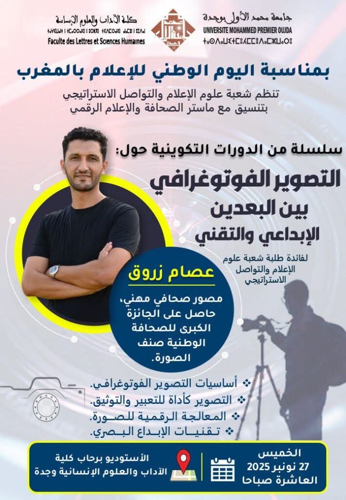 بمناسبة اليوم الوطني للإعلام بالمغرب، نظمت شعبة علوم الإعلام والتواصل الاستراتيجي بتنسيق مع ماستر الصحافة والإعلام الرقمي، دورة تكوينية حول، “التصوير الفوتوغرافي بين البعدين الإبداعي والتقني”، لفائدة طلبة الشعبة، وذلك يوم الخميس 27 نونبر 2025 بالاستديو برحاب كلية الآداب والعلوم الإنسانية بوجدة.