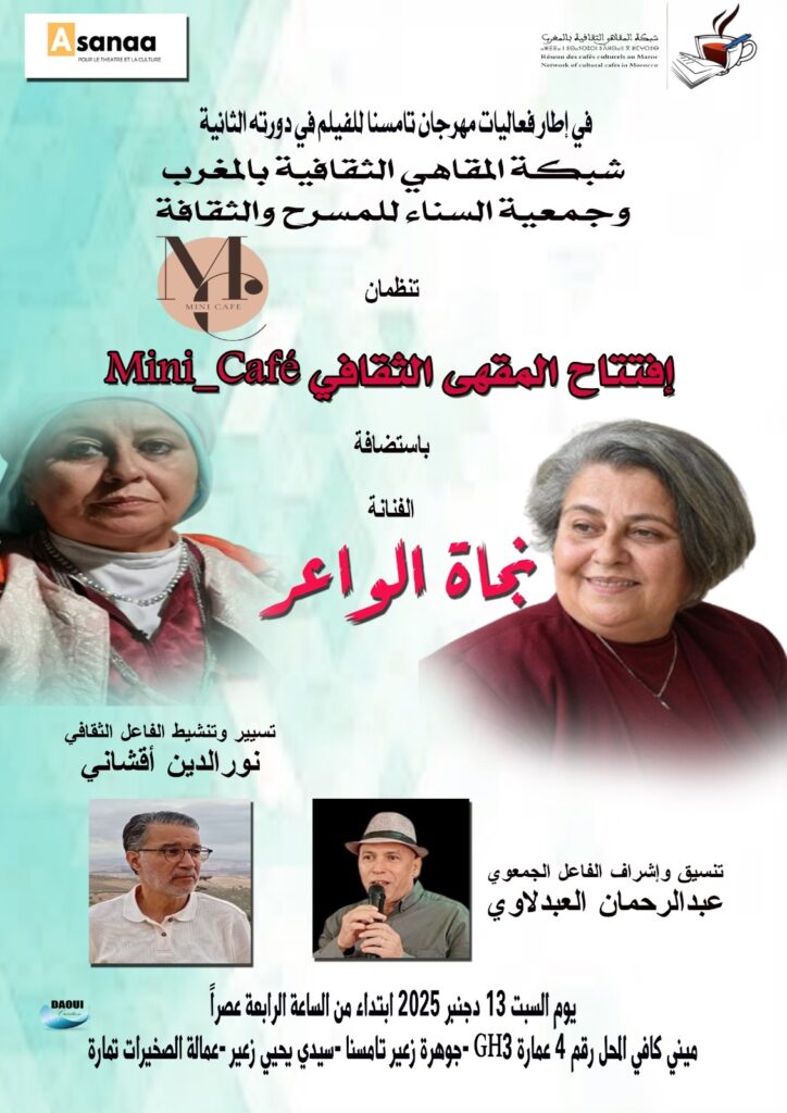 كما ستفتتح الجمعية المنظمة بتنسيق مع شبكة المقاهي الثقافية بالمغرب ،المقهى الثقافي بإستضافة الفنانة نجاة الواعر وذلك يوم السبت 13دجنبر 2025 إبتداء من الساعة الرابعة عصرا بمقهى Mini Café الكائن بتمارة GH3 جوهرة زعير بتامسنا ،بتنسيق الفاعل الجمعوي عبدالرحمان العبدلاوي وتنشيط الفاعل الثقافي نورالدين أقشاني.