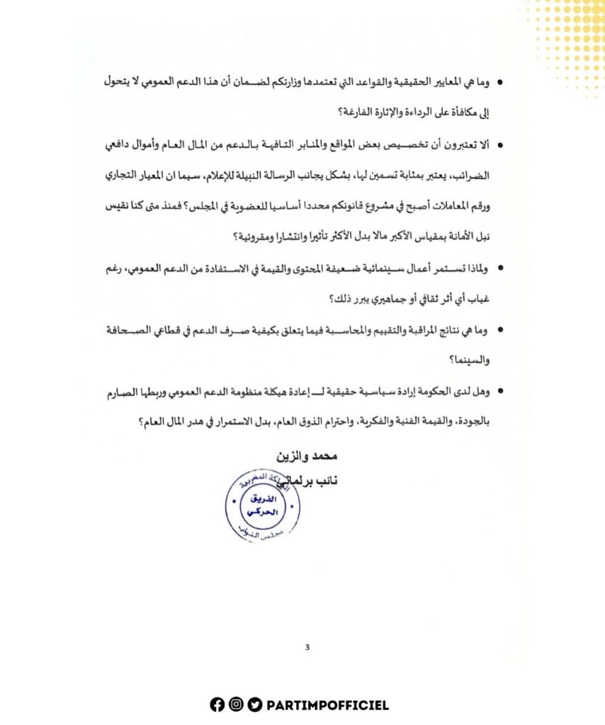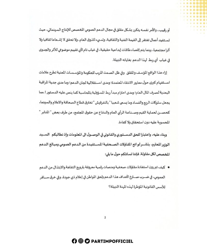 السؤال البرلماني توقف عند ما اعتبره صاحبه غموضًا في معايير الاستفادة من الدعم، وغيابًا للتوضيح الرسمي بشأن كيفية توزيعه، سواء في مجال المقاولات الصحفية أو الإنتاجات السينمائية، مشيرًا إلى أن الدعم العمومي يفترض أن يكون أداة لتشجيع الجودة والإبداع وخدمة الصالح العام.