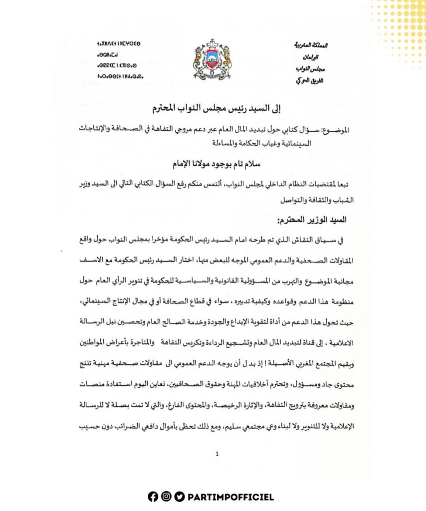 وجه الأمين العام لحزب الحركة الشعبية سؤالًا كتابيًا إلى رئيس الحكومة، أُحيل على وزير الشباب والثقافة والتواصل، بخصوص تدبير الدعم العمومي المخصص لقطاعي الصحافة والإنتاج السينمائي، في خطوة أعادت ملف الحكامة والشفافية في صرف المال العام إلى واجهة النقاش البرلماني.