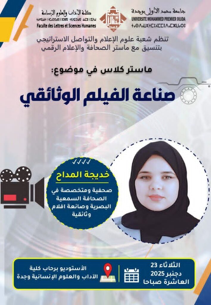 نظمت شعبت علوم الإعلام والتواصل الاستراتيجي بتنسيق مع ماستر الصحافة والإعلام الرقمي، يومه الثلاثاء 23 دجنبر 2025، ماستر كلاس في موضوع “صناعة الفيلم الوثائقي”، من تأطير خديجة مداح صحفية ومتخصصة في الصحافة السمعية البصرية وصانعة افلام وثائقية..