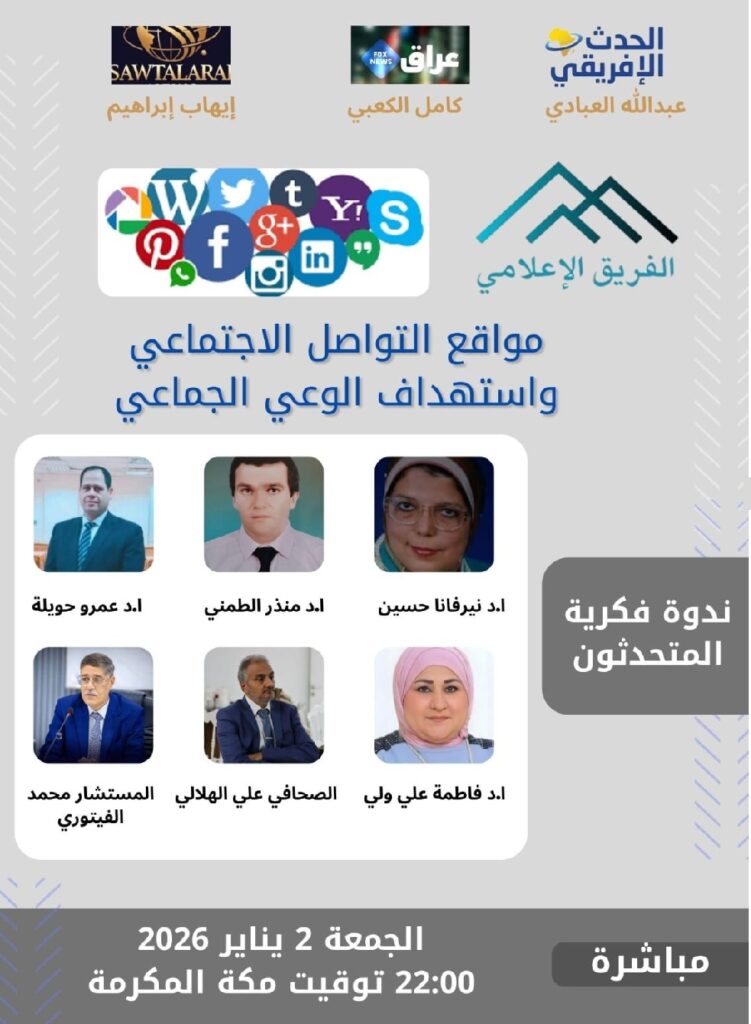 تنظم “الحدث الافريقي” و”عراق فوكس نيوز” و”صوت العرب” ندوة فكرية حول”مواقع التواصل الاجتماعي واستهداف الوعي الجماعي”، يوم الجمعة 02 يناير 2026 بتقنية عن بعد. يديرها الصحافي والكاتب عبد الله العبادي بمعية الفريق الاعلامي.