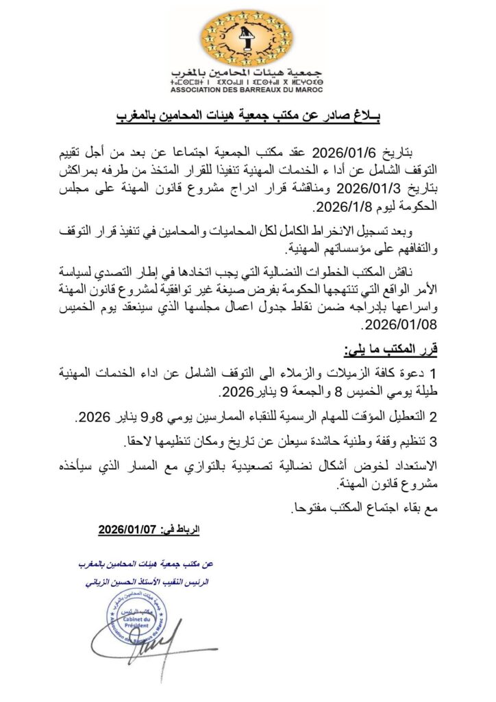 ودعا المكتب إلى التوقف الشامل عن أداء الخدمات المهنية طيلة يومي الخميس والجمعة 8 و9 يناير 2026. كما دعا إلى التعطيل المؤقت للمهام لبرسمية للنقباء الممارسين خلال هذين اليومين.