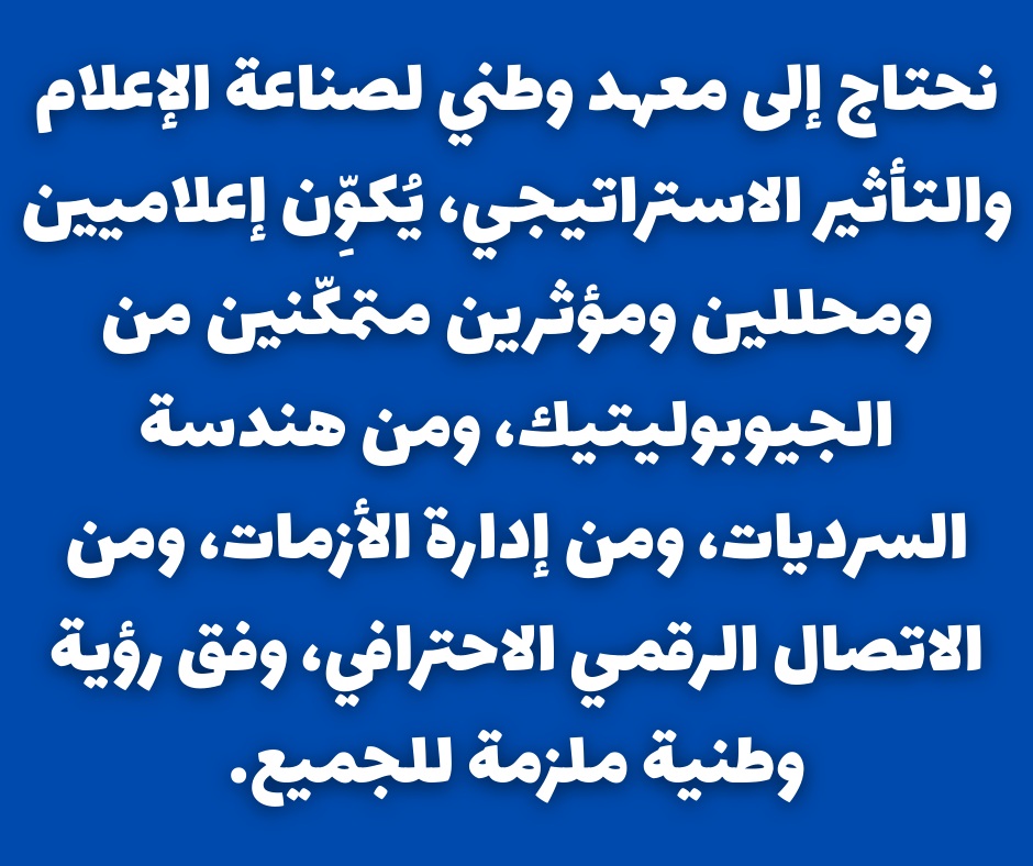 نحتاج إلى معهد وطني لصناعة الإعلام والتأثير الاستراتيجي، يُكوِّن إعلاميين ومحللين ومؤثرين متمكّنين من الجيوبوليتيك، ومن هندسة السرديات، ومن إدارة الأزمات، ومن الاتصال الرقمي الاحترافي، وفق رؤية وطنية ملزمة للجميع.