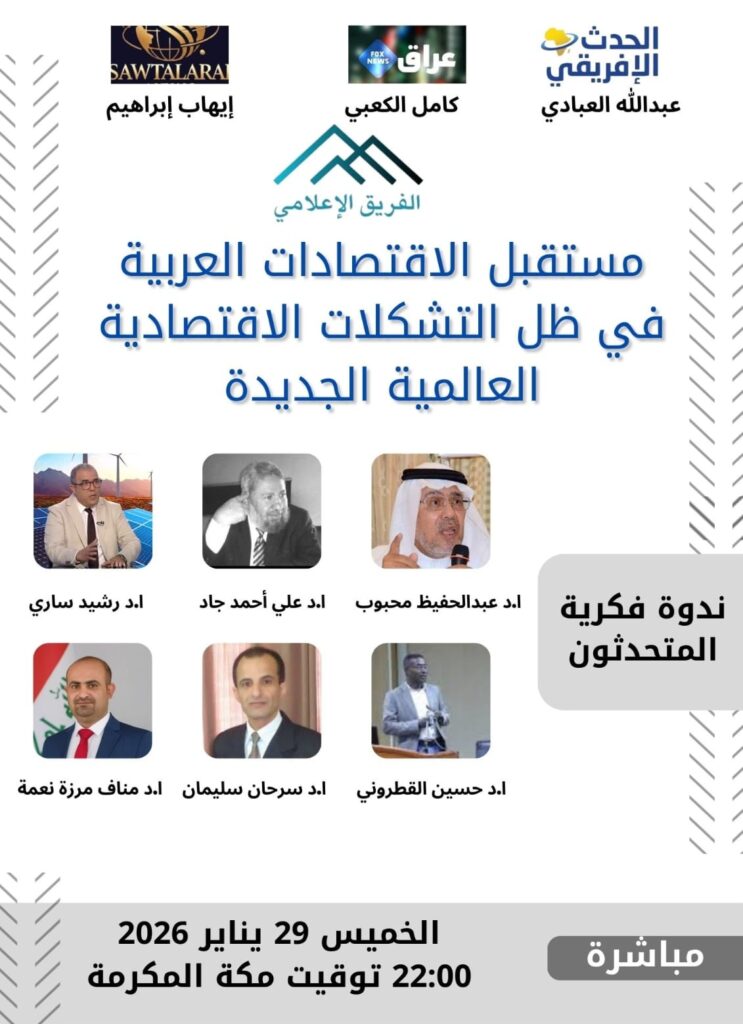 تنظم منصات “الحدث الإفريقي” و“صوت العرب”و“عراق” يوم الخميس 29 يناير 2026 ندوة اقتصادية كبرى بتقنية عن بعد، تحت عنوان “مستقبل الاقتصادات العربية في ظل التشكلات الاقتصادية العالمية الجديدة”، بمشاركة نخبة من الباحثين والخبراء العرب في مجالات الاقتصاد والتنمية.