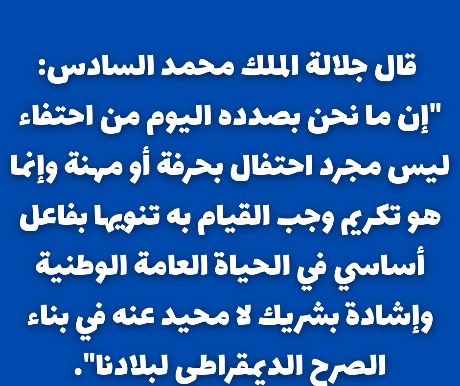 والحث على هذا التكريم ليس من باب الادعاء والمزايدات، وإنما جاء التأكيد على أن تكريم الصحفي الفاعل في مجتمعه والمساهم في دمقرطة بلاده، في رسالة سامية لجلالة الملك وجهها إلى أسرة الصحافة والاعلام بمناسبة اليوم الوطني للإعلام يوم 15/11/2002، حيث قال جلالته بهذه المناسبة إن: