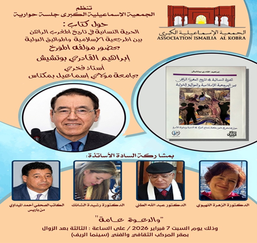 يحتضن المركب الثقافي والفني بمكناس (سينما الريف) ظهر السبت 7 فبراير جلسة حوارية حول كتاب “الحرية النسائية في تاريخ المعرب الراهن بين المرجعية الإسلامية والمواثيق الدولية”، لصاحبه المؤرخ إبراهيم القادري بوتشيش، أستاذ فخري بجامعة المولى إسماعيل، بحضور نخبة من المؤرخين والحقوقيين والباحثين الاجتماعيين.