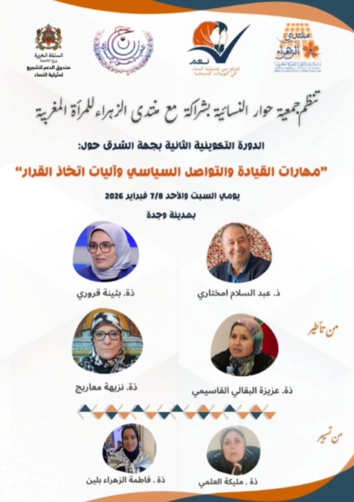 في خطوة جديدة نحو تمكين المرأة المغربية وتعزيز حضورها في مواقع القرار، تعلن جمعية حوار النسائية عن انطلاق الدورة التكوينية الثانية من مشروع “نعم”، الهادف إلى الرفع من تمثيلية النساء في الهيئات المنتخبة، وذلك بمدينة وجدة يومي 7 و8 فبراير 2026، بشراكة مع منتدى الزهراء للمرأة المغربية.