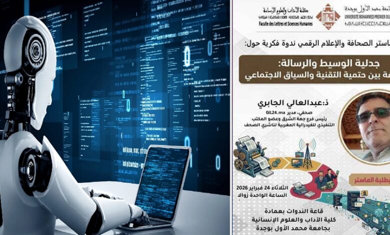 ينظم ماستر الصحافة والإعلام الرقمي بجامعة محمد الأول بوجدة، يوم الثلاثاء 24 فبراير، ندوة فكرية بعنوان “جدلية الوسيط والرسالة: الصحافة بين حتمية التقنية والسياق الاجتماعي”، يلقيها الباحث والإعلامي عبد العالي الجابري، بحضور أساتذة وطلبة وإعلاميين وباحثين في مجال الإعلام والاتصال.