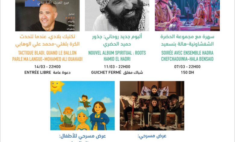 تنطلق فعاليات برنامج مارس/رمضان، يوم 07 مارس بسفر موسيقي مدهل إلى قلب التقاليد الشفشاونية مع هالة بنسعيد وفرقتها، من خلال فن الحضرة الشفشاونية، حيث تتعانق الإيقاعات الساحرة مع الأصوات الروحية والآلات التقليدية في أجواء غامرة ومفعمة بالإحاسيس.