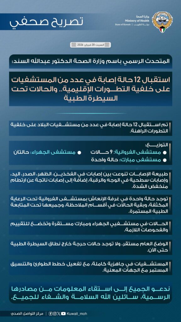 أعلنت وزارة الصحة الكويتية، اليوم الأحد 1 مارس 2026، عن تسجيل حالة وفاة واحدة وإصابة 31 آخرين، جميعهم من الجنسيات الأجنبية، في حصيلة أولية للضربات الصاروخية الإيرانية التي استهدفت البلاد.