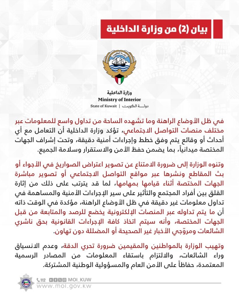 وفي سياق متصل، شددت وزارة الداخلية الكويتية على منع تصوير عمليات الاعتراض الجوي أو تداول مقاطعها عبر منصات التواصل الاجتماعي، مؤكدة أنها ستتخذ إجراءات قانونية صارمة بحق مروجي الشائعات، تزامناً مع إعلان الجيش الكويتي نجاح دفاعاته في التعامل مع 97 صاروخاً باليستياً و283 طائرة مسيرة منذ بدء التصعيد.