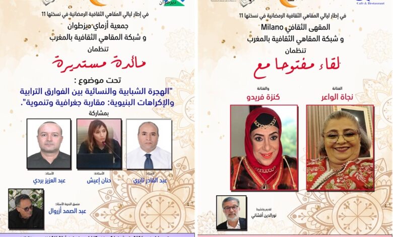 تواصل شبكة المقاهي الثقافية بالمغرب أنشطتها الرمضانية بتنظيم النسخة ال11من ليالي المقاهي الثقافية الرمضانية بمدينتي الرباط وجرسيف وفق البرنامج التالي :