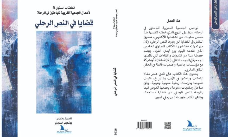 صدر عن منشورات الجمعية المغربية للباحثين في الرحلة (2026) الكتاب السنوي المحكّم الخامس للجمعية المغربية للباحثين في الرحلة في 283 صفحات من الحجم الكبير، ويحمل عنوان ” قضايا في النص الرحلي” تحرير وتنسيق بوشعيب الساوري ومراجعة أحمد بوغلا، وقد صمم غلافه باقتدار فني الأستاذ توفيق البيض.