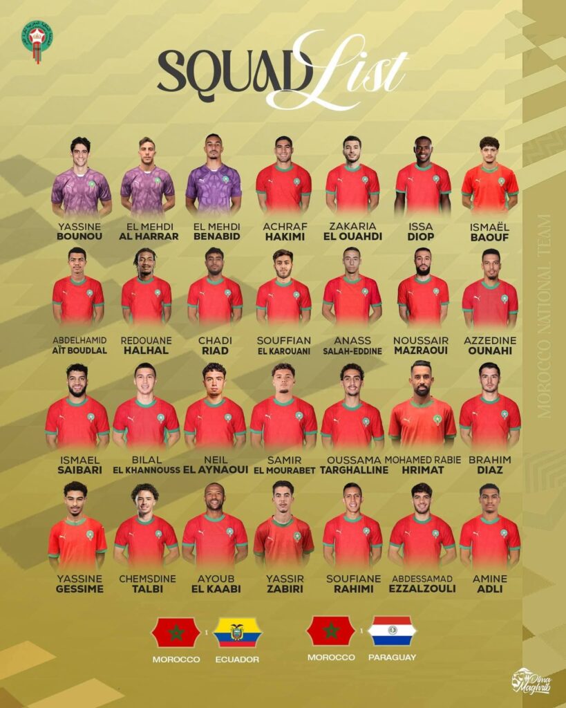 أعلن محمد وهبي، المدير الفني للمنتخب المغربي، عن قائمة المنتخب الوطني استعدادًا للمواجهتين الوديتين أمام الإكوادور والباراغواي، في خطوة واضحة لتعزيز خطط التجديد والتجريب داخل صفوف “أسود الأطلس”.