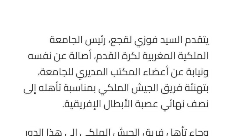 في خطوة تعكس التقدير الرسمي للإنجازات القارية، تقدم الجامعة الملكية المغربية لكرة القدم، برئاسة فوزي لقجع، بتهنئة رسمية إلى الجيش الملكي، عقب تأهله المستحق إلى نصف نهائي دوري أبطال إفريقيا، بعد تجاوز عقبة بيراميدز المصري.