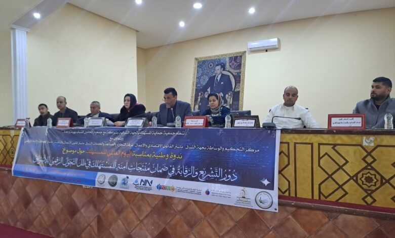 احتفاءا باليوم العالمي للمستهلك، نظمت جمعية حماية المستهلك بجهة الشرق، بشراكة مع جمعية المحامين الشباب بهيئة وجدة، وبتعاون مع ماستر الصحافة والاعلام الرقمي، ماستر القانون الاقتصادي والاعمال وقانون ماستر قانون الاعمال والمنافسة وغرفة التجارة والصناعة والخدمات الشرق، ندوة وطنية حول موضوع، “دور التشريع والرقابة في ضمان منتجات آمنة للمستهلك في ظل التحول الرقمي للأسواق..”، وذلك زوال يوم الجمعة 27 مارس 2026 بمقر الغرفة.