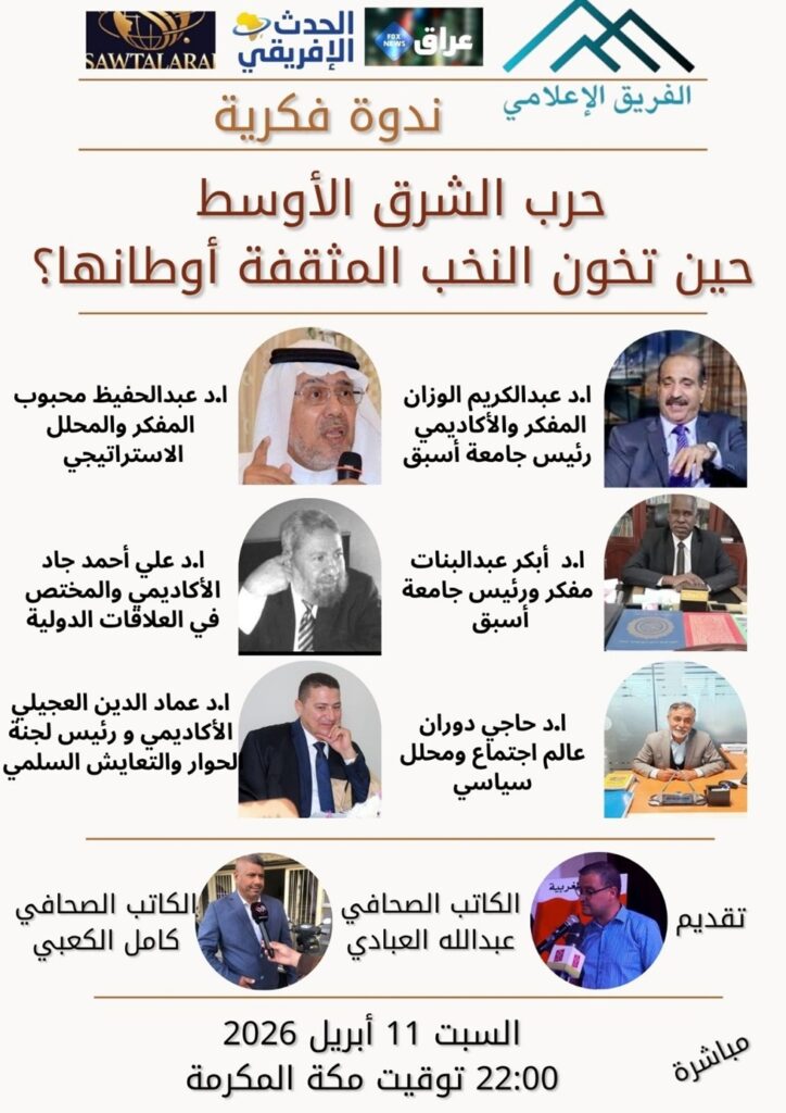 ينظم “الحدث الإفريقي، بتنسيق مع عراق الشرق، وصوت العرب، ندوة فكرية بعنوان “حرب الشرق الأوسط: حين تخون النخب المثقفة أوطانها؟”، اليوم السبت 11 أبريل 2026، في تمام الساعة العاشرة مساءً بتوقيت مكة المكرمة، عبر بث مباشر على المنصات الإعلامية المشاركة.