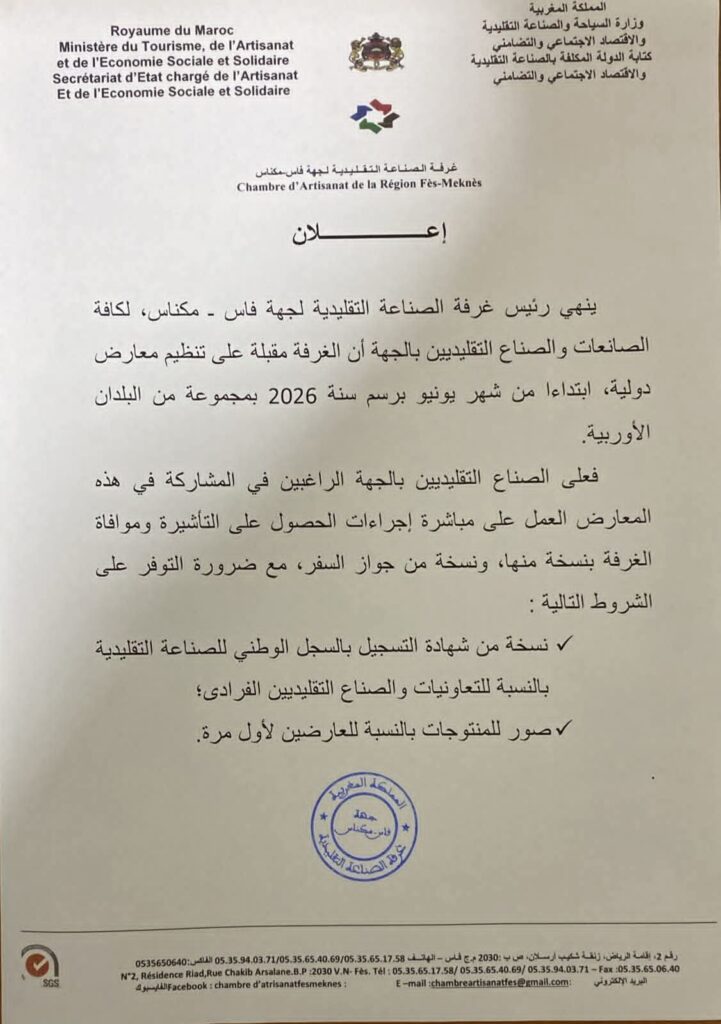 غرفة الصناعة التقليدية بفاس–مكناس تعلن تنظيم معارض دولية وتدعو الصناع للمشاركة
