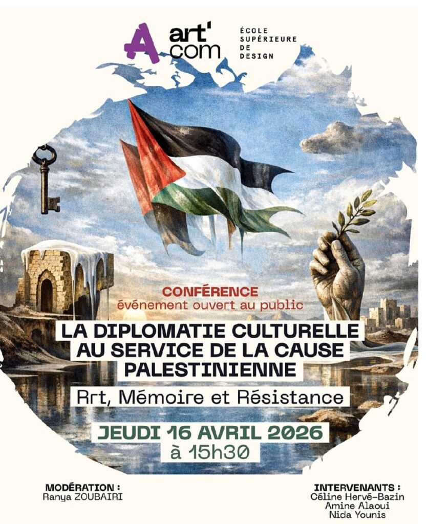 تنظم مؤسسة “أرت كوم سوب” بالرباط، غدا الخميس 16 أبريل 2026، لقاءً مفتوحاً حول موضوع “الدبلوماسية الثقافية في خدمة القضية الفلسطينية: الفن، الذاكرة والمقاومة”، وذلك في إطار أنشطة الوساطة الثقافية التي يشرف عليها مختبر البحث والابتكار في التصميم والتواصل.