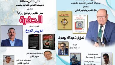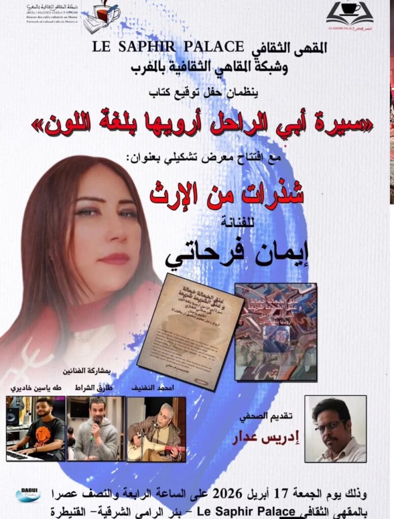 ينظم المقهى الثقافي “لوسافير بلاص ” وشبكة المقاهي الثقافية بالمغرب حفل توقيع كتاب ” سيرة أبي الراحل أرويها بلغة اللون ” ، مع افتتاح معرض تشكيلي بعنوان شذرات من الإرث للفنانة إيمان فرحاتي ، وذلك يوم الجمعة 17 أبريل 2026 على الساعة الرابعة والنصف عصرا بمقهى le saphir palace بئر الرامي الشرقية بالقنيطرة .